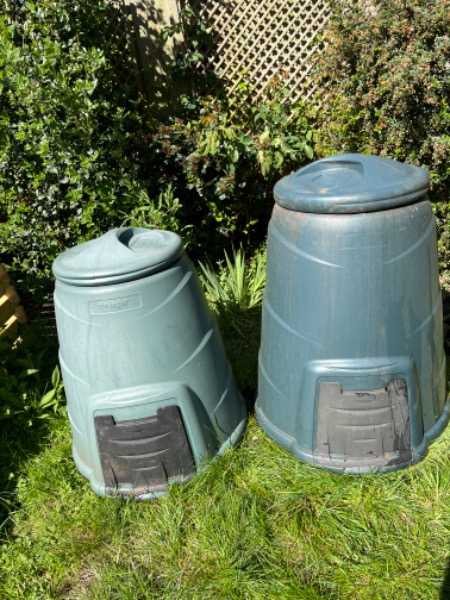 Two (2j large compost bins. I also have a traditional black refuse bin with holes drilled in the ba…