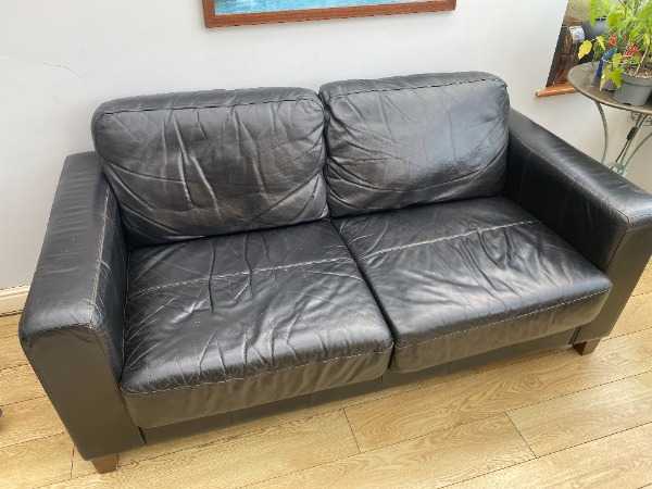 A very neat and tidy 2/3 seater sofa, in good condition. Very realistic faux black leather finish, I inherited this sofa, and can't tell if it is real leather or not, so am listing as faux. Nice proportions and very comfortable. It has nice modern solid wood legs, see picture The sofa does not come with the occasional cushions as shown in one of the pictures. The two black back cushions are attached by Velcro and can be removed. Sorry we will not arrange delivery, this must be picked up. Dimension: Height 85cm x length 165cm x width 90cm